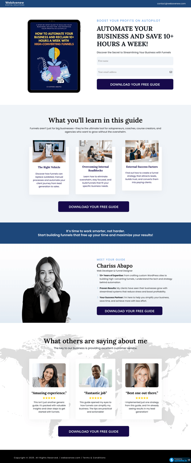 What if you had a system that brings in leads & sales 24/7? Imagine a funnel that runs on autopilot, generating leads and sales while you sleep. No more tech headaches, wasted ad spend, or inconsistent revenue.